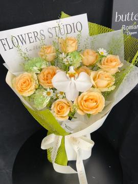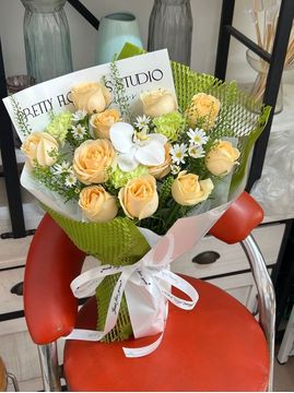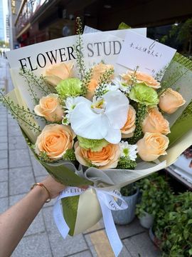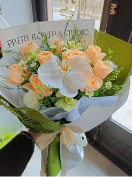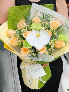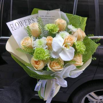 | 材料 | 10支香槟玫瑰,1朵白色蝴蝶兰,3支绿色康乃馨(若没有用绿桔梗替换),搭配绿铃草,白色小雏菊丰满间插 |