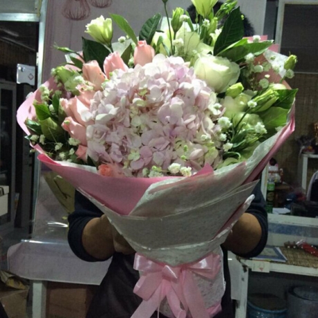 | 材料 | 1朵粉绣球,6朵香槟玫瑰,5朵苏醒,白桔梗3枝,粉色雏菊适量,情人草搭配,栀子叶点缀 |