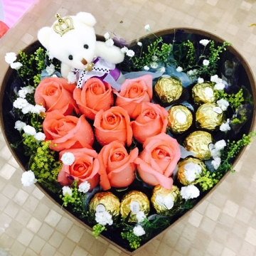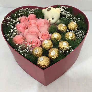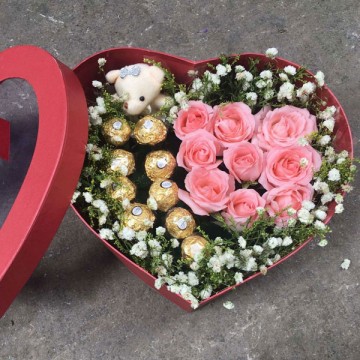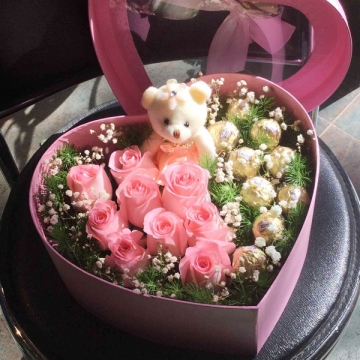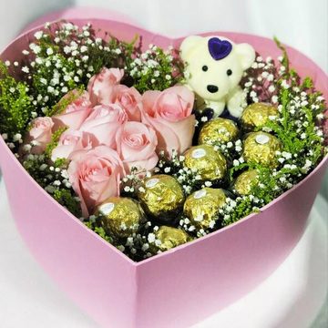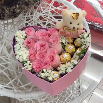 | 材料 | 9枝粉玫瑰,9颗巧克力,黄莺满天星搭配,随机赠送一只可爱小公仔 |