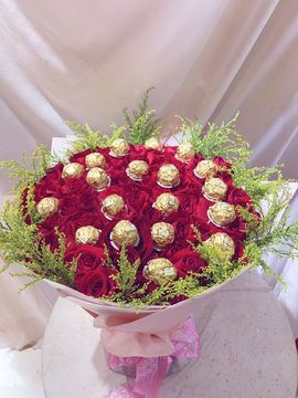 | 材料 | 19颗精美巧克力,66朵精品红玫瑰,搭配一只可爱的小熊。 |