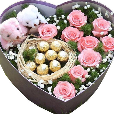 | 材料 | 精选9朵粉玫瑰,9颗费列罗巧克力,2只小熊,搭配黄莺、绿叶。 |