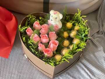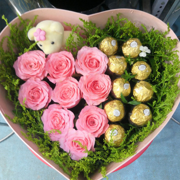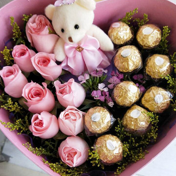 精选9朵精品戴安娜玫瑰+9颗费列罗巧克力+精美小熊一只,配黄莺适量。