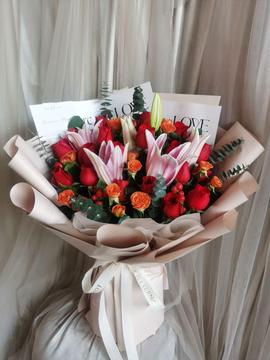 | 材料 | 19支红玫瑰,2支粉色多头百合,3支橙色泡泡玫瑰,搭配尤加利叶,红豆间插! |