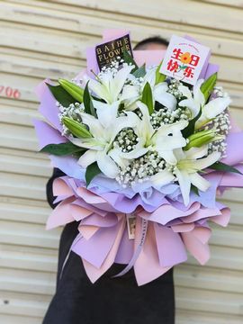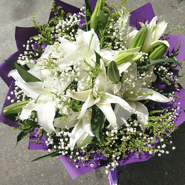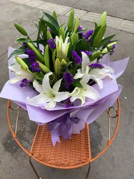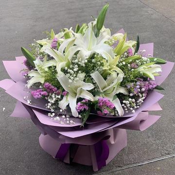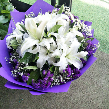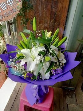 | 材料 | 5枝白色多头百合,搭配满天星、黄莺、外围勿忘我点缀。 |