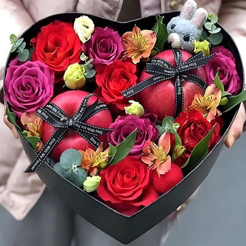 | 材料 | 4支红玫瑰,4支弗洛伊德玫瑰,2个苹果(如图装饰蝴蝶结),搭配橙色水仙百合,绿桔梗,尤加利叶,1个红色小球,1个玩偶兔子 |