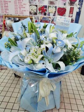 材料 | 9支碎冰蓝玫瑰,6支多头白百合(喷色),搭配白桔梗、小雏菊、尤加利叶丰满间插 |
