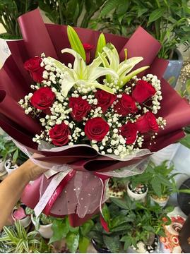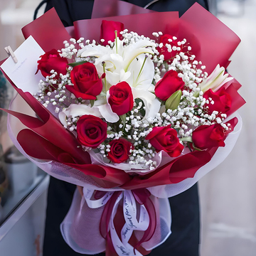 材料 | 11支红玫瑰,2支多头白百合,搭配白色满天星丰满间插 |