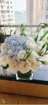 优质蓝色绣球2朵,21朵白色桔梗栀子叶间插。