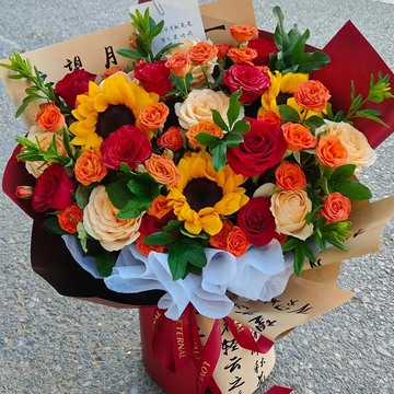 材料 | 3支向日葵,9支红玫瑰,7支香槟玫瑰,搭配橙色多头泡泡,迎春花叶丰满间插 |