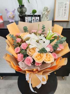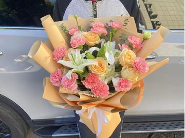 | 材料 | 14朵粉色康乃馨+5朵香槟玫瑰玫瑰+2枝多头白百合,尤加利叶间插点缀 |