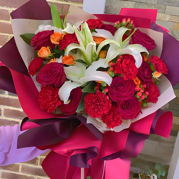 | 材料 | 8支红玫瑰,10支红色康乃馨,2支多头白百合,搭配红豆,橙色多头泡泡丰满间插 |