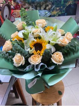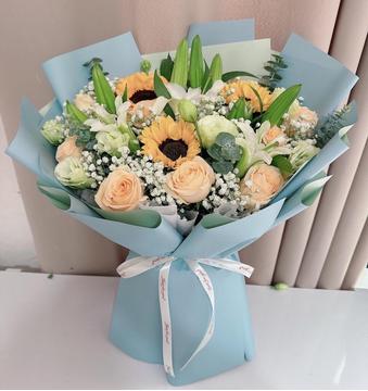 | 材料 | 11支香槟,3支向日葵,3支白色多头白百合,3支白色桔梗,搭配满天星尤加利叶点缀! |