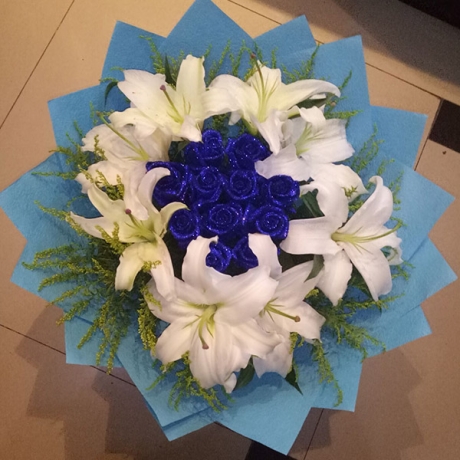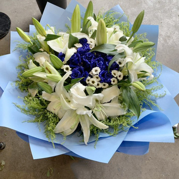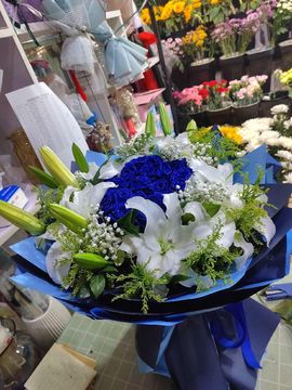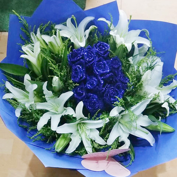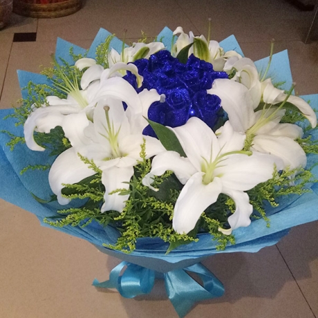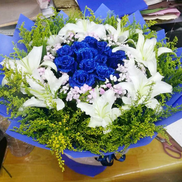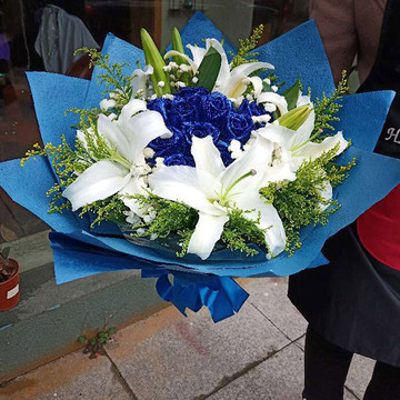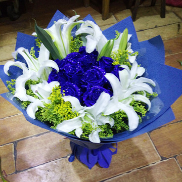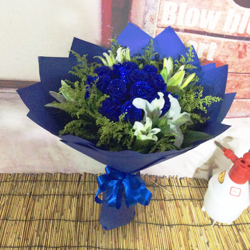 | 材料 | 精选19朵精品蓝色妖姬,5支多头香水百合,搭配黄莺。 |