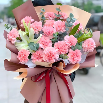 材料 | 17支粉色康乃馨,2支多头白百合,搭配尤加利叶丰满间插 |