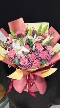 | 材料 | 17支粉色康乃馨,2支多头白百合,搭配尤加利叶丰满间插 |