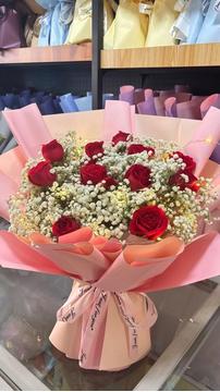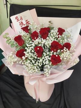 材料 | 11枝红玫瑰,搭配尤加利叶白色满天星丰满间插。 |