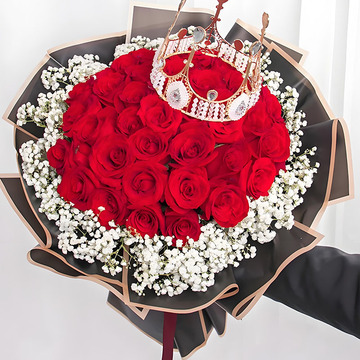 | 材料 | 33支红玫瑰,外围白色满天星,表面装饰一顶皇冠 |