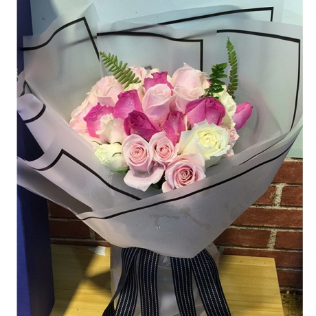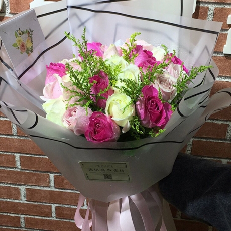 | 材料 | 33朵戴安娜、白玫瑰、大桃红玫瑰混搭,马尾松针间插 |
