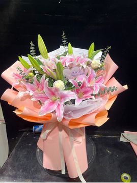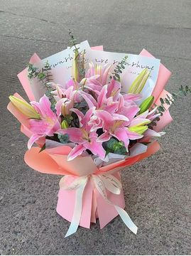 | 材料 | 5支多头粉百合,搭配尤加利叶间插 |