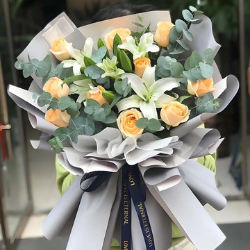 | 材料 | 11支香槟玫瑰,3支多头白百合,搭配尤加利叶丰满间插 |