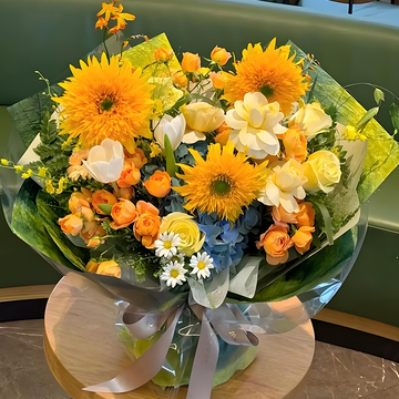 | 材料 | 3支向日葵(若没有泰迪向日葵用黑心替换),6支黄玫瑰(或香槟替换),1支蓝绣球,2支白色郁金香,搭配果汁阳台多头泡泡,跳舞兰、火焰兰、小雏菊、小盼草、绿灵草、喷泉草、高山羊齿蕨丰满间插 |