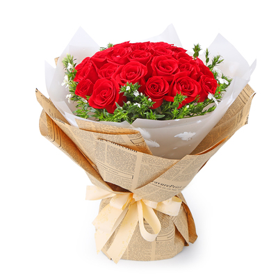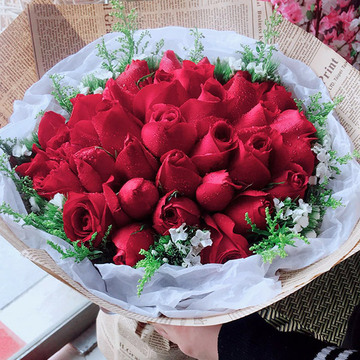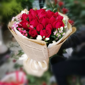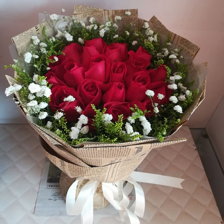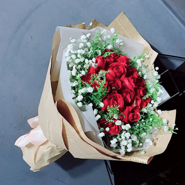 | 材料 | 21朵红玫瑰,外围石竹梅丰满点缀。 |