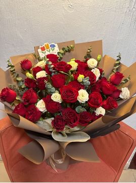 | 材料 | 33支红玫瑰,搭配白色洋桔梗,尤加利叶丰满间插 |
