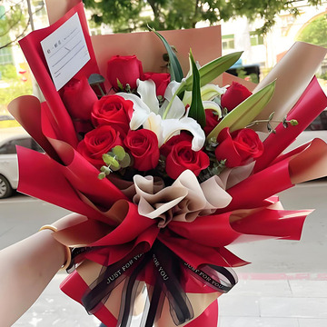 材料 | 11支红玫瑰,2支多头白百合,搭配尤加利叶丰满间插 |