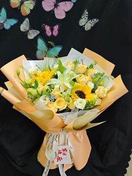 | 材料 | 2支向日葵(如没绿心用黑心替换),19支香槟玫瑰,2支多头白色百合,搭配翠珠、蓝星花、喷泉草、绿铃草丰满,六出百合丰满间插 |