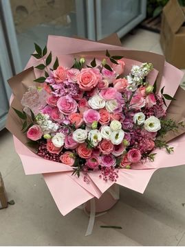 | 材料 | 4支粉绣球,8支洛神玫瑰,13支艾莎玫瑰,搭配白桔梗、粉桔梗、白色紫罗兰、粉色满天星、尤加利叶丰满间插 |