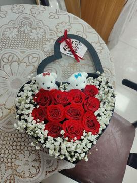 | 材料 | 11支红玫瑰,搭配两只可爱小熊、适量满天星。 |