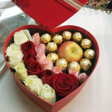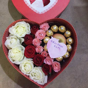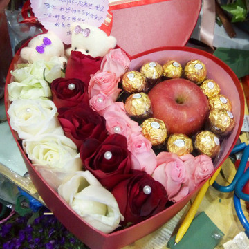 | 材料 | 5枝白玫瑰,5枝红玫瑰,7枝戴安娜玫瑰,11颗巧克力,1个苹果,珍珠点缀 |