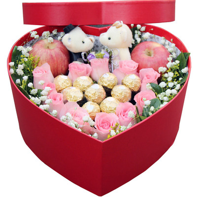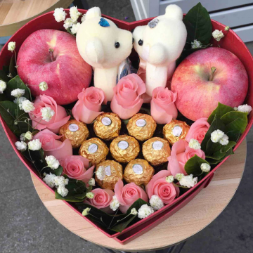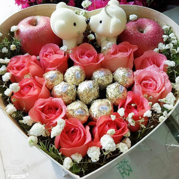 | 材料 | 11朵戴安娜粉玫瑰,9颗费列罗巧克力,2个苹果,2只小熊 |