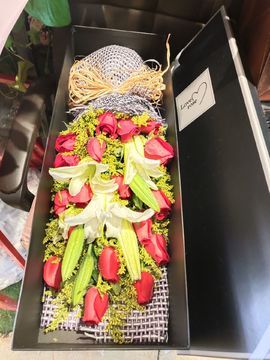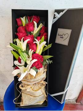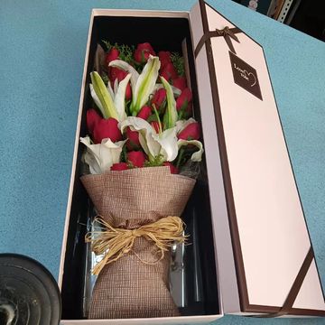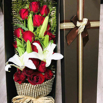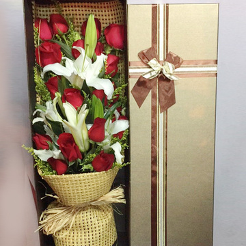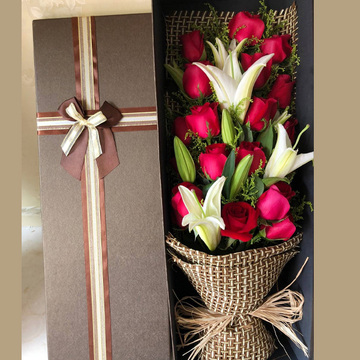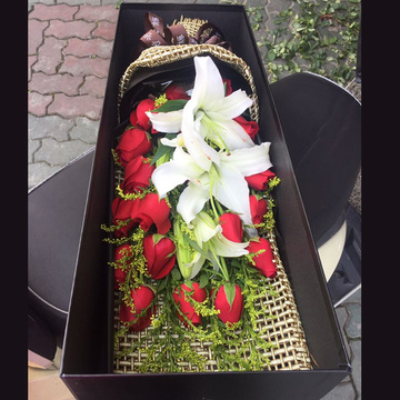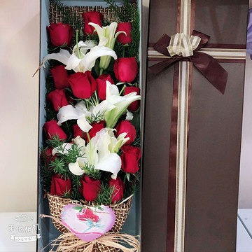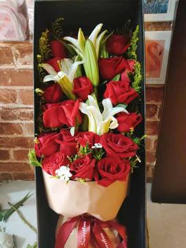 | 材料 | 19朵红玫瑰,3枝多头白百合,黄莺间插 |