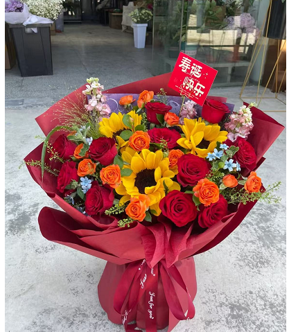 材料 | 各色扶郎花, 粉色百, 金鱼草, 散尾 ,红色绵纸装饰 |