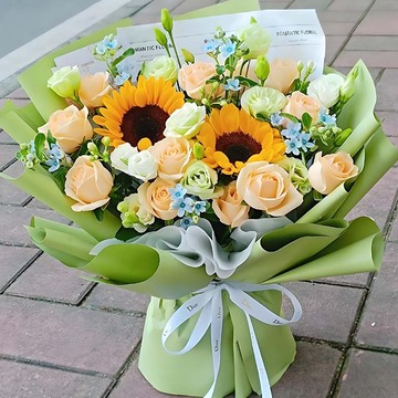 材料 | 2支向日葵,12支香槟玫瑰,搭配绿桔梗和白桔梗、蓝星花丰满间插 |