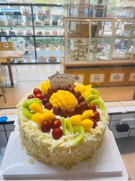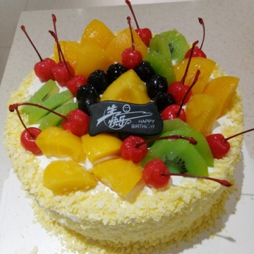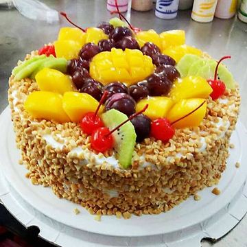 | 材料 | 圆形鲜奶水果蛋糕,时令水果铺满,果仁碎屑围边 |