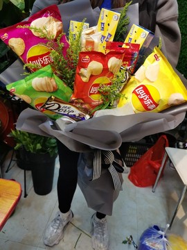 | 材料 | 乐事薯片、德芙小巧粒、奥利奥巧心结、沙琪玛、彩虹糖、饼干等13袋零食,黄莺间插(零食包装袋颜色图片为主,所有零食均在超市购买,根据所在超市货源可替换同价位) |