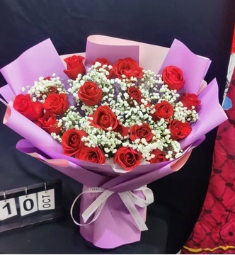 | 材料 | 19朵红玫瑰,搭配白色满天星 |