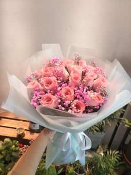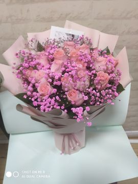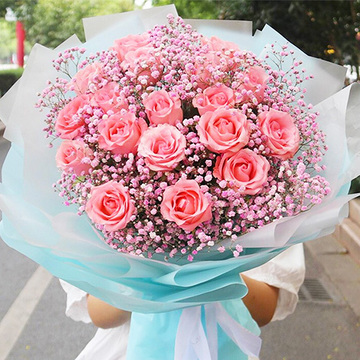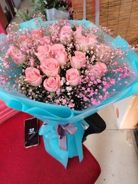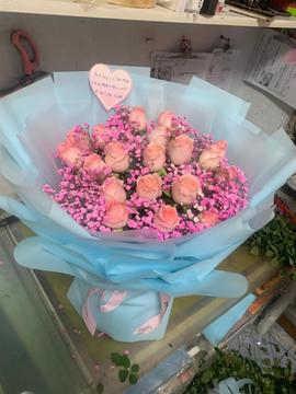 | 材料 | 19朵戴安娜粉玫瑰,粉色满天星丰满间插搭配 |