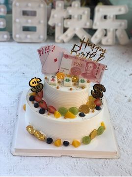 材料 双层圆形水果蛋糕,下层各色时令水果装饰,上层麻将装饰、金色包装巧克力等装饰,一张100元道具