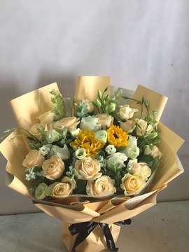 | 花语 | 香槟色玫瑰与朝气向日葵,经过花艺师之手赋予了爱的意义,将这份藏于心底的爱,包裹在一起,今晚你好吗?今夜的美妙愿你永远记住,你是我心中最甜美的公主! |