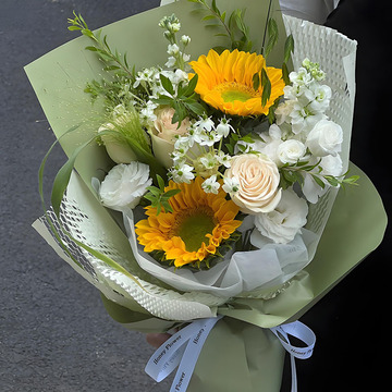 材料 | 2支向日葵(如没绿心用黑心替换),2支香槟玫瑰,3支白玫瑰,搭配白桔梗、天鹅绒、喷泉草、白色紫罗兰、小盼草、九星叶丰满间插 |
