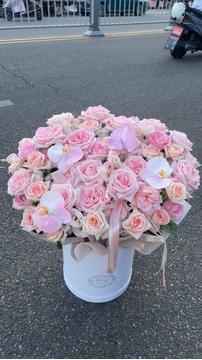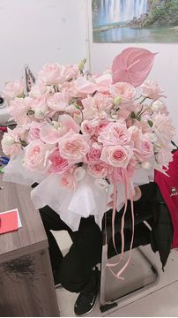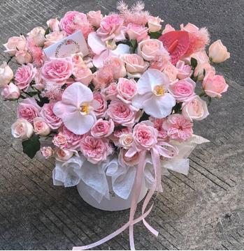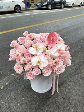 | 材料 | 52支粉荔枝玫瑰,3朵白色蝴蝶兰(喷粉色),搭配白色桔梗,粉蓬莱松、红掌丰满间插 |