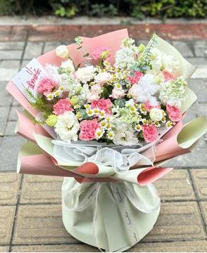 材料 11支粉色康乃馨,1支多头水仙百合,搭配白色紫罗兰,小雏菊,尤加利叶丰满间插