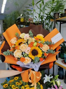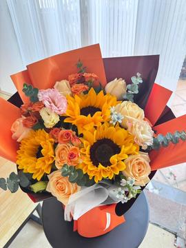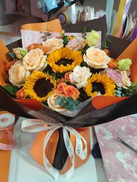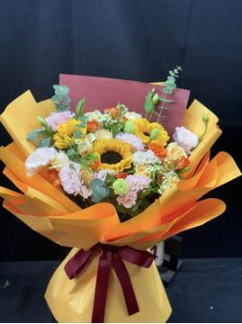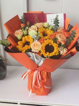 | 材料 | 3朵向日葵,7支香槟玫瑰,搭配粉色卷边洋桔梗、橙色多头泡泡,尤加利叶,小雏菊、蓝星花丰满间插 |
