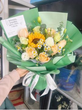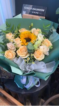 | 材料 | 1支向日葵,6支香槟玫瑰,搭配白桔梗、小雏菊,尤加利叶丰满间插 |