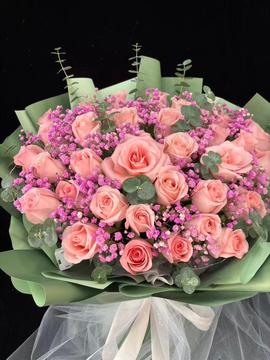 材料 | 33朵精品粉色戴安娜玫瑰,搭配满天星、尤加利叶装饰。赠送彩灯一根. |