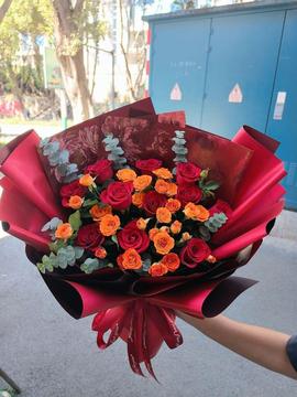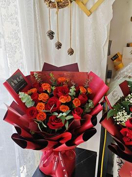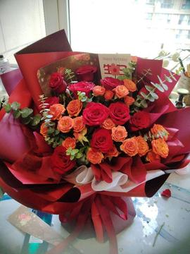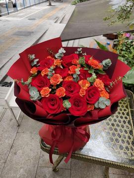 | 材料 | 11支红玫瑰,5支橙色多头泡泡,搭配尤加利叶丰满间插 |