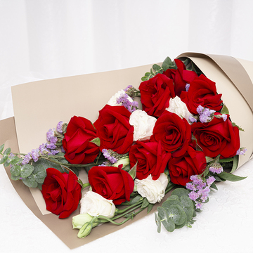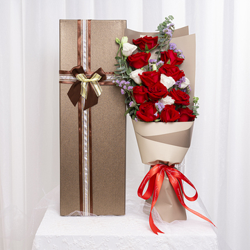 | 材料 | 11枝卡罗拉红玫瑰,白色洋桔梗2枝,粉色勿忘我,尤加利叶点缀 |